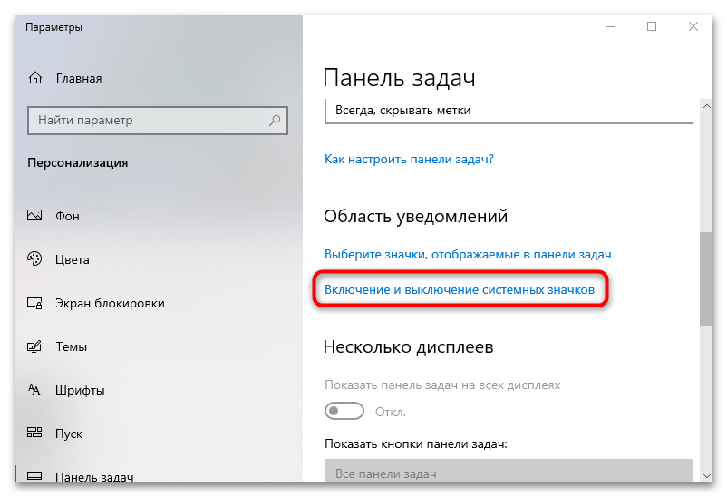Откроется окно «Параметров», где нужно нажать на строку «Включение и выключение системных значков».