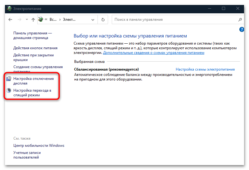 Ниже в «Панели управления» есть переход к настройкам отключения дисплея, а также параметров спящего режима.