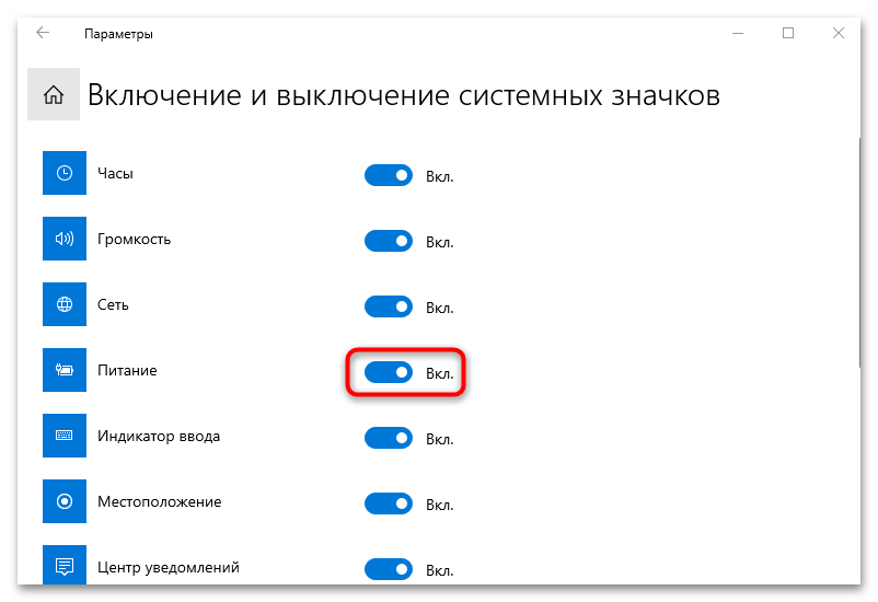 Далее активируйте отображение значка аккумулятора, переведя тумблер у «Питания» во включенное состояние.