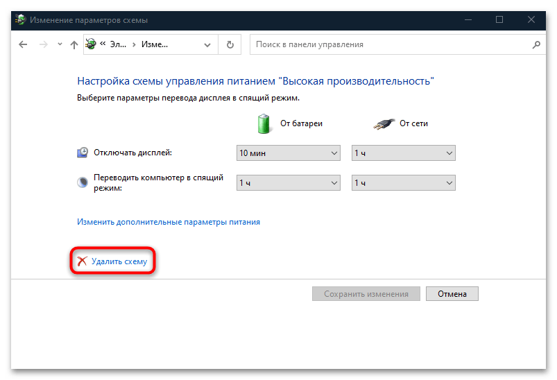 Чтобы удалить созданный план электропитания, назначьте активным любой другой план и затем напротив названия плана, который хотите удалить, нажмите Настройка плана электропитания. На открывшейся странице нажмите Удалить план
