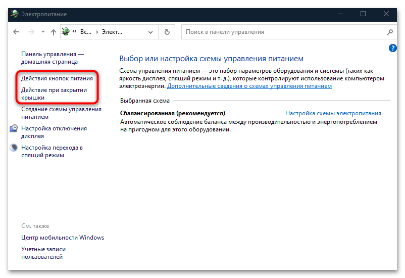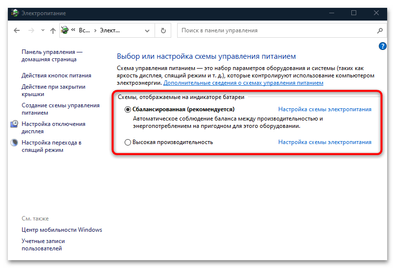 Теперь вернемся к разделу «Электропитание» и центральной части окна. В зависимости от аппаратной составляющей и настроек системы, здесь доступен выбор схемы электропитания. В нашем случае это «Сбалансированная» и «Высокая производительность». В первом случае система работает так, чтобы сэкономить энергоресурсы, а во втором – на полную мощность.