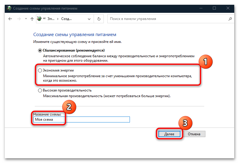 В первом шаге укажите шаблон схемы и задайте ей имя. Чтобы компьютер работал в режиме энергосбережения, выбирайте такой план, как «Экономия энергии». Нажмите по кнопке «Далее».