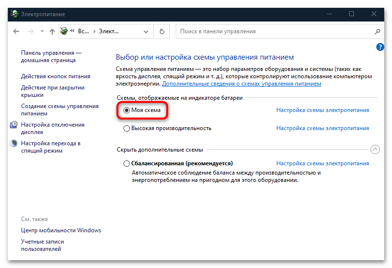 После этого созданная схема будет отображаться в основном окне раздела «Электропитания», что позволит переключиться на нее в любой момент.