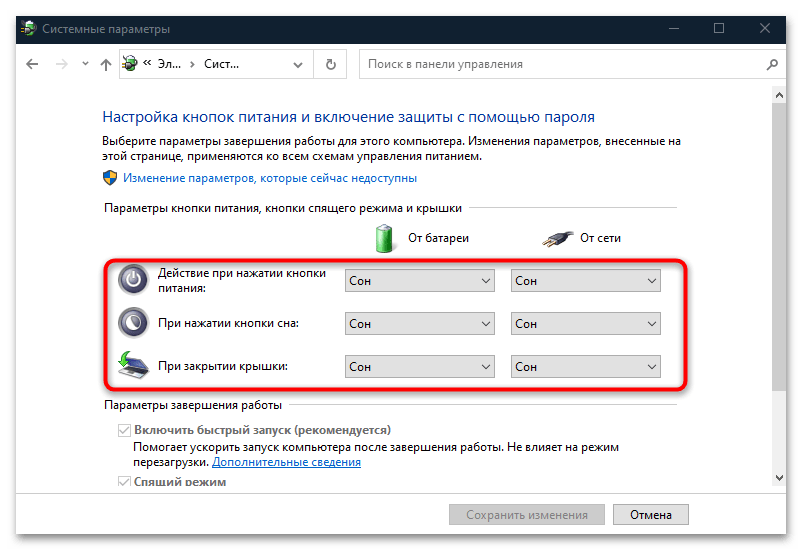 Первые два пункта подразумевают выбор поведения системы при нажатии на кнопку питания и при закрытии крышки ноутбука: будет ли устройство уходить в сон или сразу завершать работу.