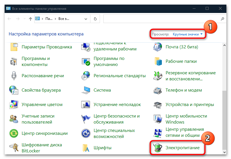 В меню «Просмотр» выберите «Крупные значки» для удобства, затем перейдите в раздел «Электропитание».