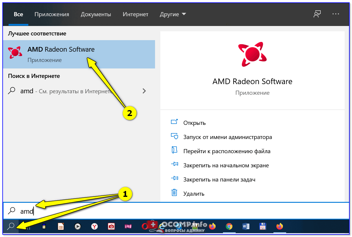 Кстати, в ОС Windows 10 весьма неплохо реализован поиск: если нажать по значку с лупой (возле ПУСК) и ввести аббревиатуру «AMD» (или «Intel», «nVidia») — автоматически будет найдена ссылка на панель управления графикой.