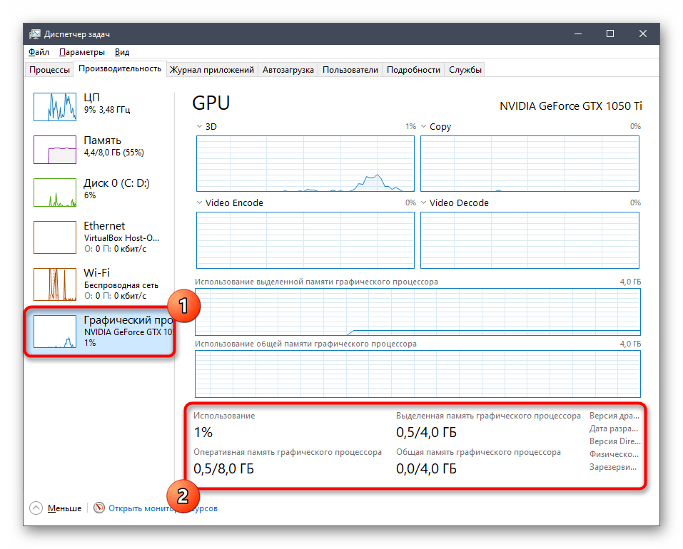 Штатное приложение «Диспетчер задач» — отличный вариант ознакомиться с текущими показателями графического адаптера, историей нагрузки и основными параметрами. Для получения требуемых сведений понадобится сделать всего пару кликов.