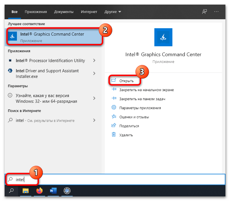 Нажмите на иконку средства или текстовую строку на панели задач. Введите запрос intel graphics – должен появиться соответствующий результат, по которому нужно кликнуть для открытия.