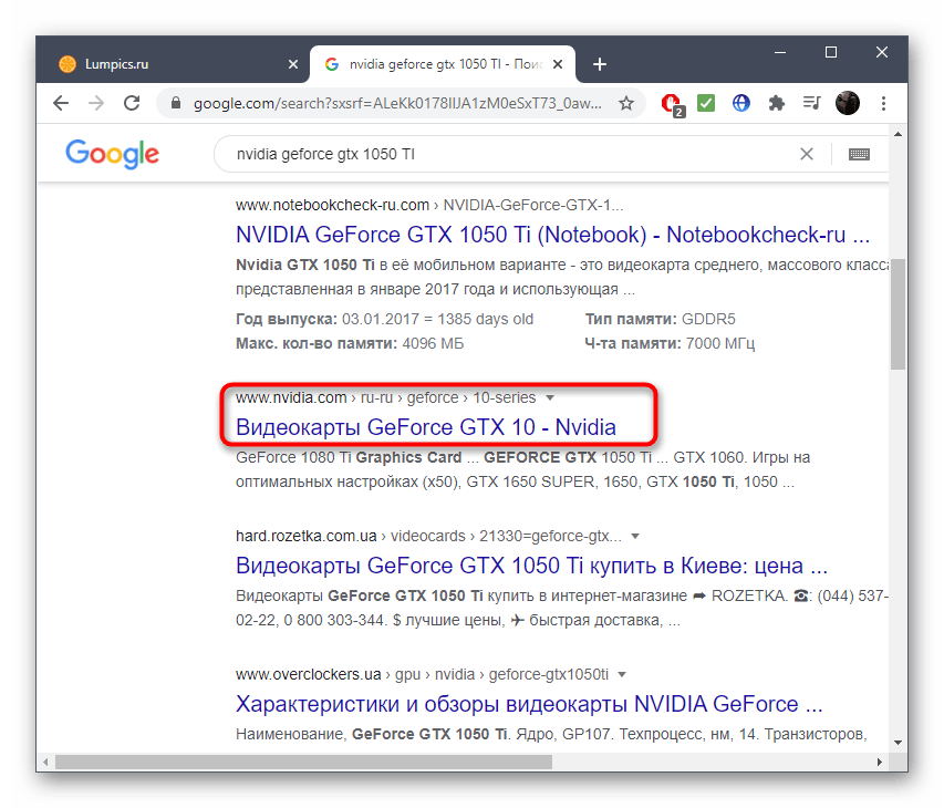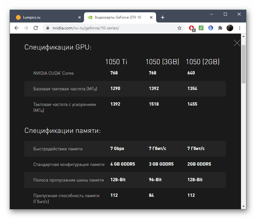 Официальная страница модели видеокарты — лучший источник полной сводки информации об устройстве. Если вам показалось, что рассмотренные только что решения не показывают полную картину, воспользуйтесь этим методом.