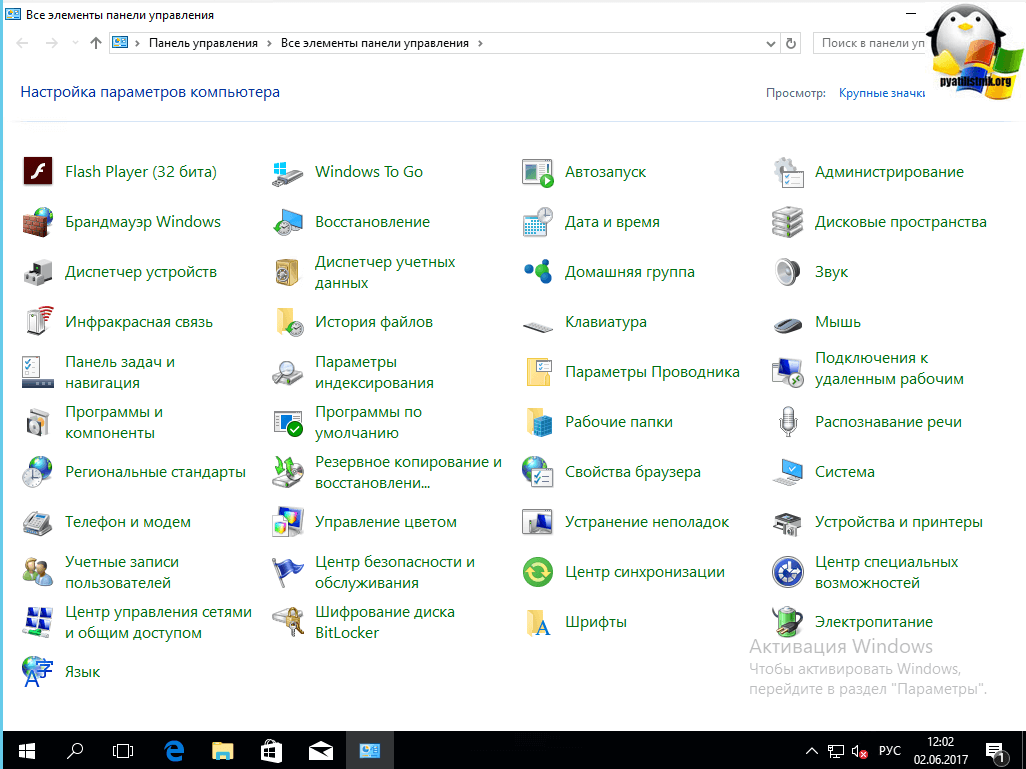 Степень детализации возможностей панели управления может быть изменена, если в верхнем выпадающем списке «Просмотр» поменять «Категория» на «Крупные значки» или «Мелкие значки». В этом случае каждый инструмент отображается автономно (см. ниже).