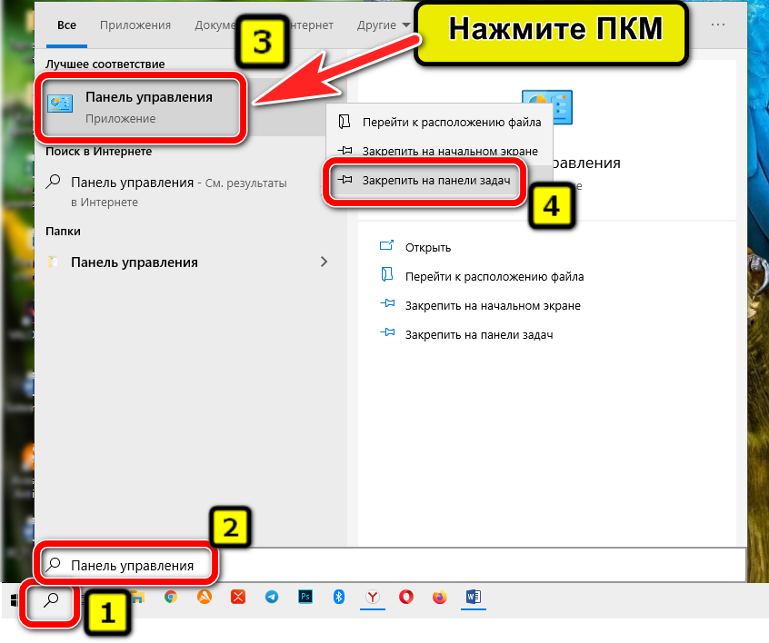 Так вот, достаточно щелкнуть по этому значку (1), и вписать в строку поиска «панель» (2), как Windows предложит вам наиболее соответствующий вариант (3) — то бишь в данном случае «Панель управления» (в англ. версии Windows — «Control Panel» ). Как и показано на скрине ниже.
