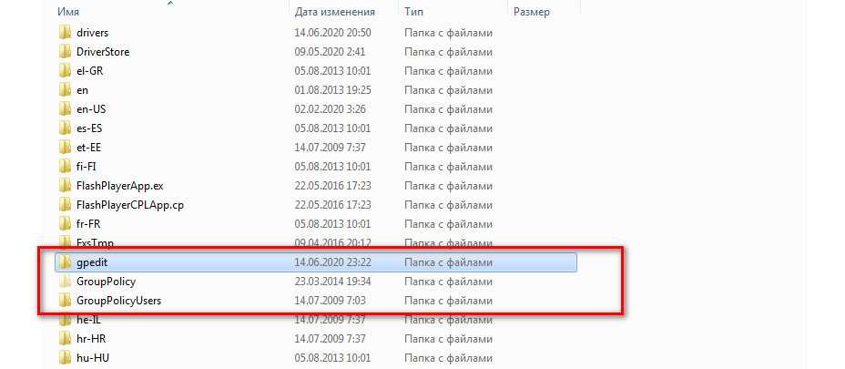 - Затем скопируйте папки GroupPolicy, GroupPolicyUsers, GPBAK и файл gpedit.msc из директории C:WindowsSysWOW64 в C:WindowsSystem32.