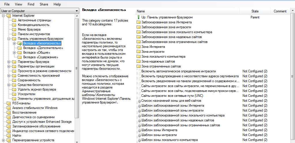 На экране отобразится полная копия редактора групповых политик. Процесс редактирования параметров осуществляется так же, как и в Gpedit.msc.