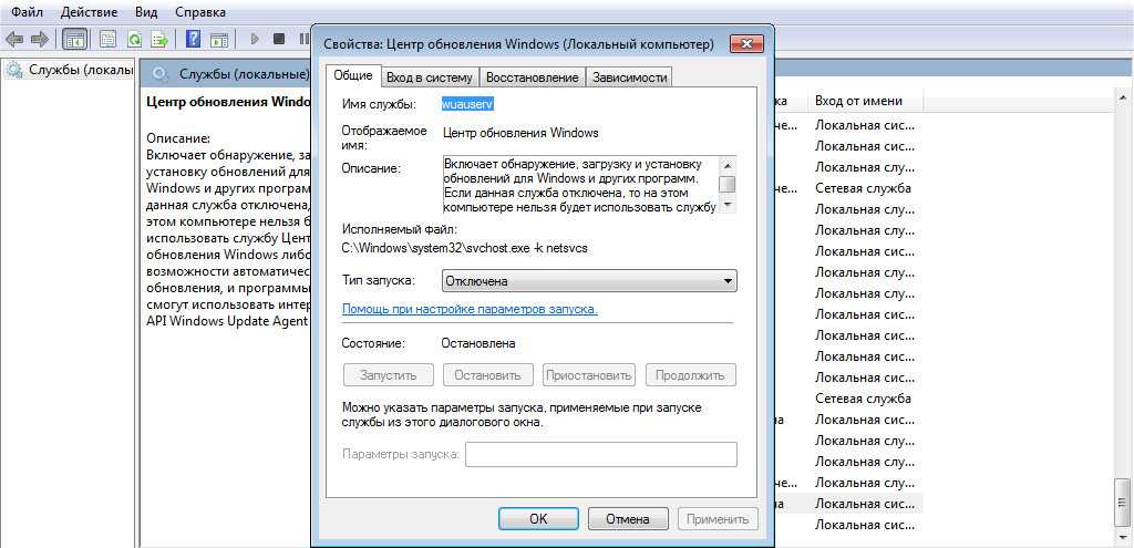 Отключение обновлений Windows лучше производить путем остановки зависимых служб: