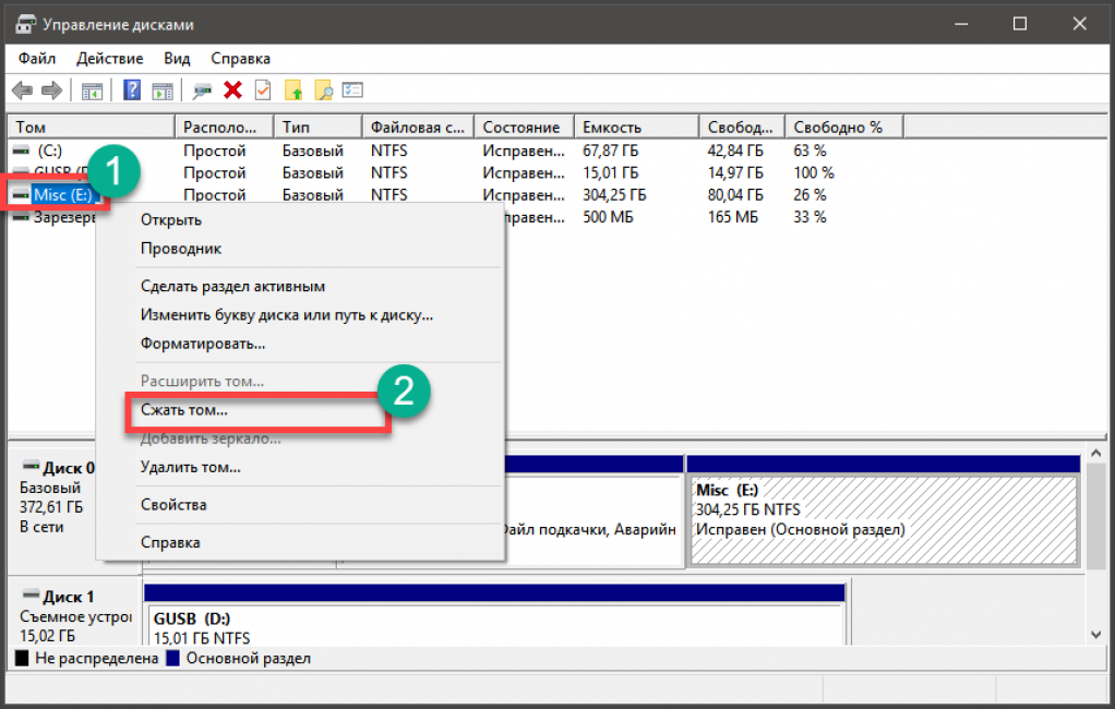 - Щёлкните правой кнопкой мыши диск, который нужно сжать, и выберите команду «Сжать том». Команда «Сжать том» позволяет отделить от тома лишнее место, и перенаправить его в неразмеченную область жёсткого диска