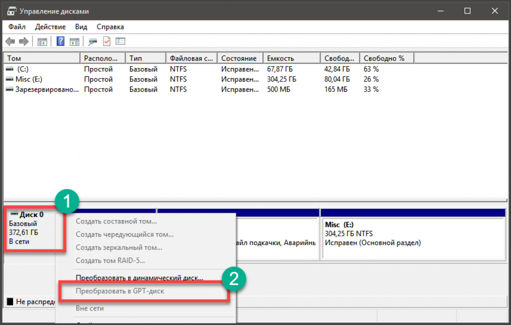 Управление дисками позволяет вам легко преобразовать жесткий диск из системы разделов MBR в GPT и обратно. Это не означает, что текущий системный диск MBR может быть преобразован в GPT, так как предварительно придется удалить все разделы на нем.