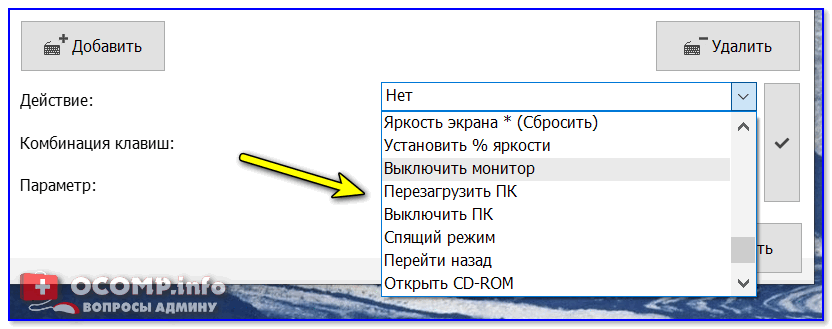 А во-вторых, в ее настройках есть раздел с “горячими клавишами”, на которые можно “повесить” практически всё, что угодно: спящий режим, выключение, перезагрузку, открытие дисковода, изменение яркости, громкости, и т.д. и т.п. (скрины ниже ????).