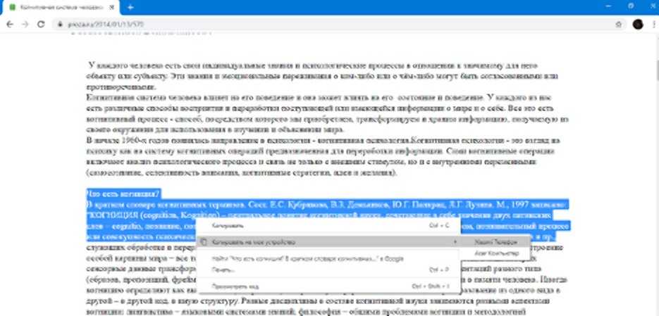После того, как вы сделали все необходимое, можно приступать к передаче информации через единый буфер обмена. Для этого запустите браузер Google Chrome Canary на компьютере и зайдите на любой сайт с текстовой информацией. На веб-странице выделите любой фрагмент текста и кликните по нему правой кнопкой мыши. Помимо привычных пунктов в контекстном меню будет доступен вариант «Копировать на мое устройство».