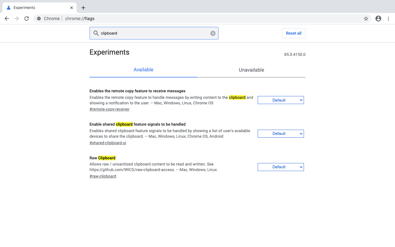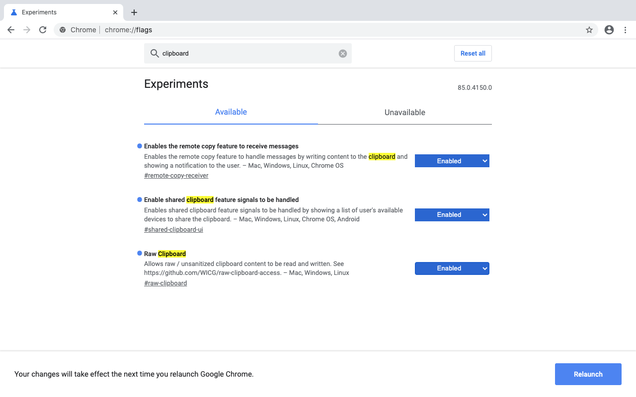 Далее нужно активировать три флага в скрытых опциях десктопного браузера. Для этого нужно запустить Google Chrome Canary на компьютере и перейти по адресу chrome://flags и вписать в открывшуюся поисковую строку слово «clipboard».