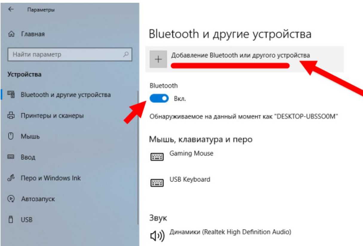 2) В параметрах проверьте, что Bluetooth включен, а затем нажмите кнопку «Добавление Bluetooth или другого устройства». Пример на скриншоте ниже.