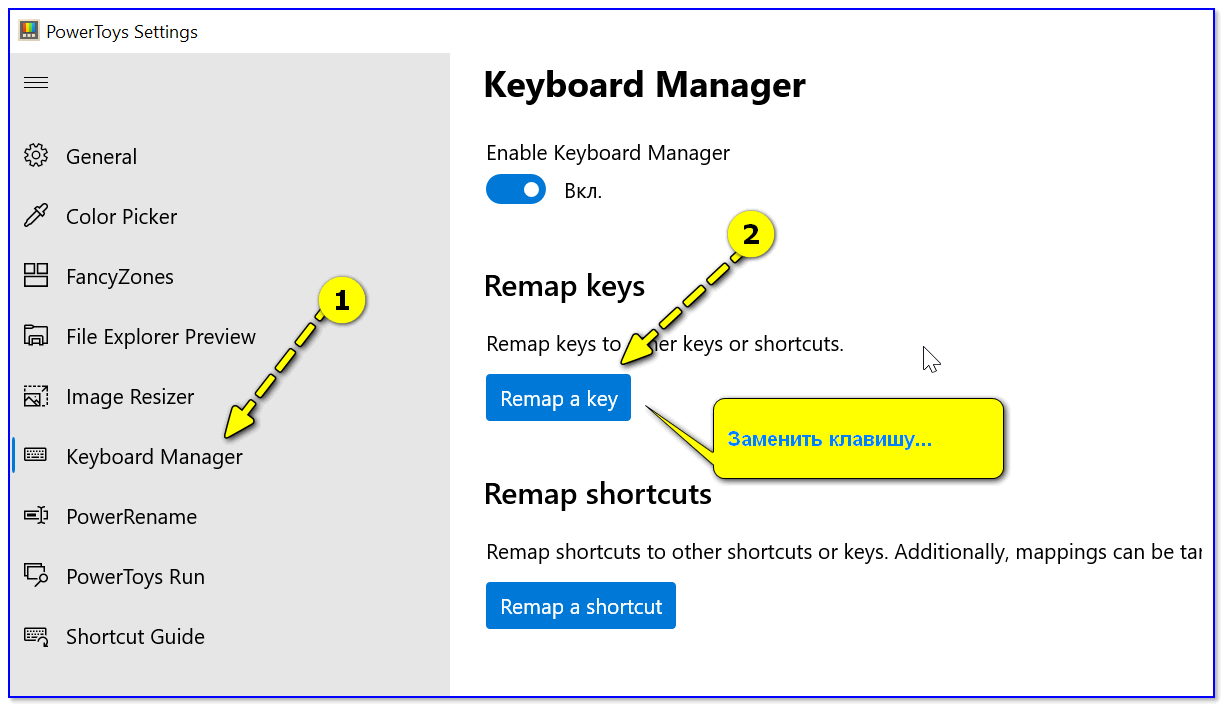 Среди инструментов в Windows 10 есть еще приложение PowerToys, в котором есть функционал Keyboard Manager, позволяющий изменить сочетания клавиш, в том числе для смены языка в Windows 10 и не только.