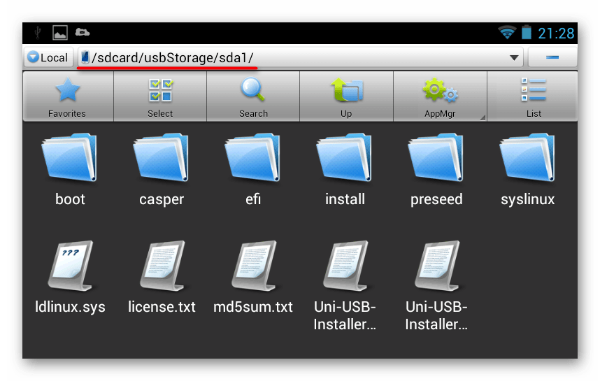 После того, как вы установите приложение, необходимо сделать его открывающимся по умолчанию для USB-устройства, а также предоставить ему права суперпользователя. После этого вами будет получен путь к файлам, которые лежат на флешке. Отыскать их можно будет через любой скачиваемый файловый менеджер, имеющийся в ассортименте для любого девайса. Найти его можно в папке usbStorage, она располагается условно на карте памяти (которой может и не быть).