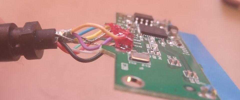 В общем ту самую часть корпуса, на которой написано “SATA”, можно без проблем вскрыть, подковырнув отверткой или специальной лопаточкой для вскрытия корпусов телефона например. На фотографиях видна халтура китайцев, когда какую-то часть проводов USB кабеля запаяли, а какую-то не залудив просто придавили каким-то подобием лака красного цвета, предназначенным то ли для защиты пайки от коррозии, то ли с целью контроля дальнейшего вмешательства в монтаж. Провода RXD (желтый) и RXN (фиолетовый) вроде как достаточно важные и я залудил и запаял их на свои места.