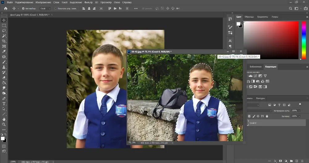 - выбрать второе фото, объект которого вы хотите переместить на новый фон;