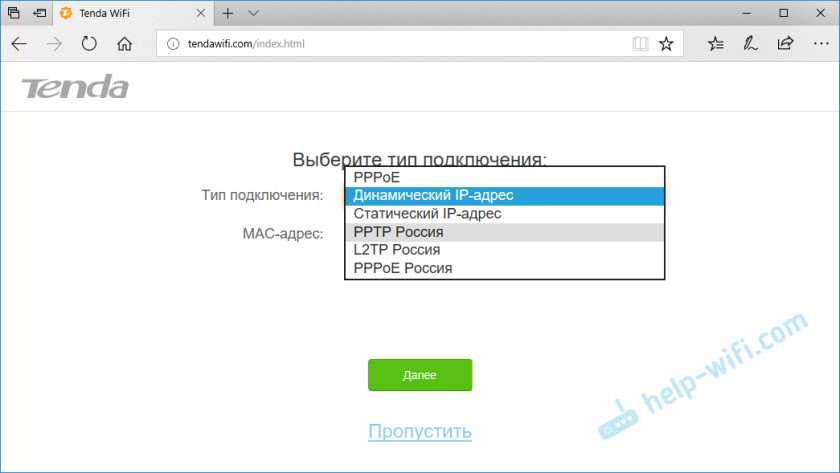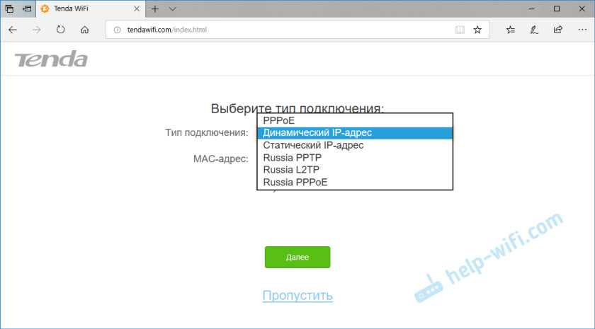 Продолжаем настройку. После нажатия на кнопку «Старт» роутер предложит задать самые важные настройки – для подключения к интернету. Вам необходимо точно знать, какой тип подключения использует ваш интернет-провайдер. И уже в зависимости от типа подключения – необходимые параметры (логин, пароль). Делает ли провайдер привязку по MAC-адресу. Если делает, то необходимо прописать MAC-адрес Tenda AC10U (он указан на наклейке) у провайдера, либо клонировать на роутер MAC-адрес с компьютера, к которому привязан интернет.