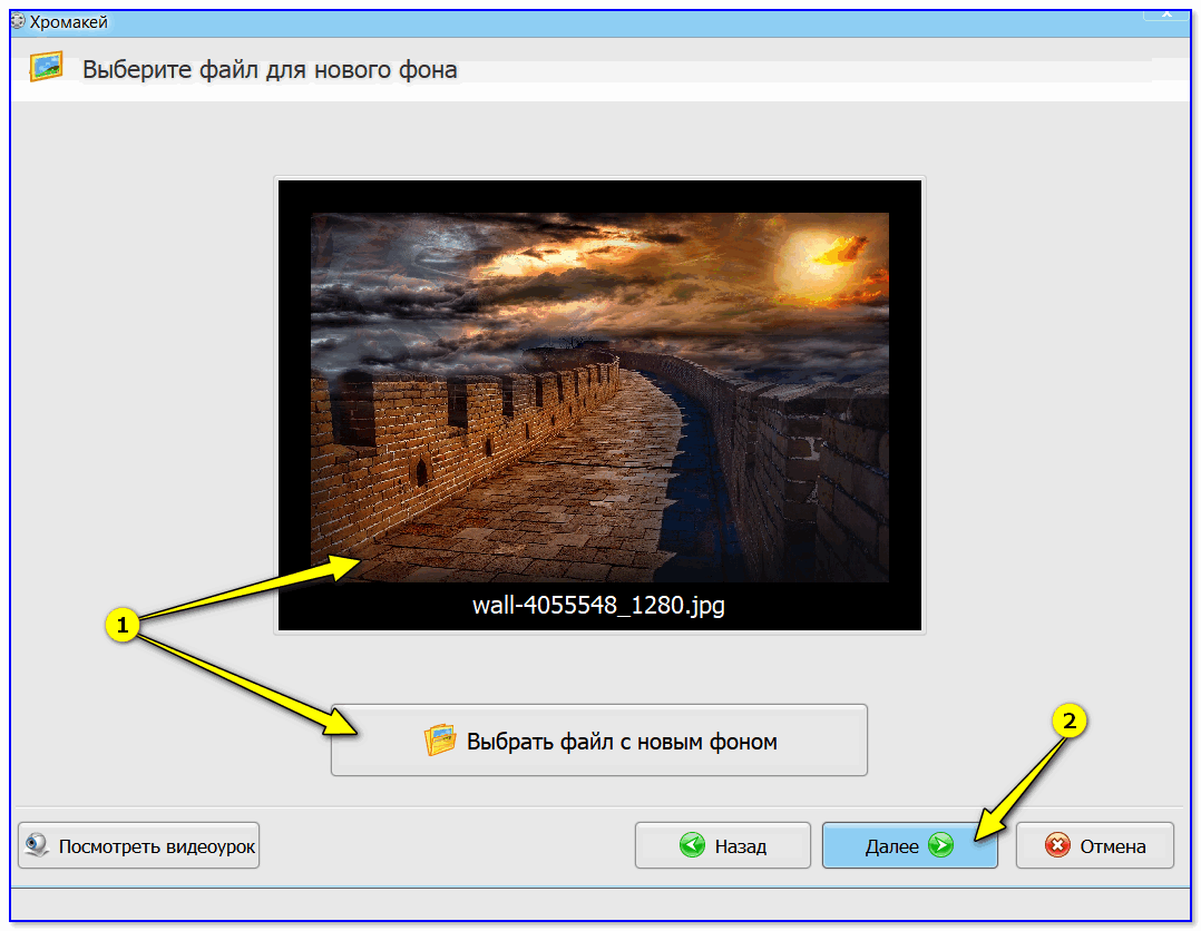 - После этого потребуется загрузить в редактор видеофайл с хромакеем. Чтобы сделать это, нажмите «Выбрать видео с одноцветным фоном».