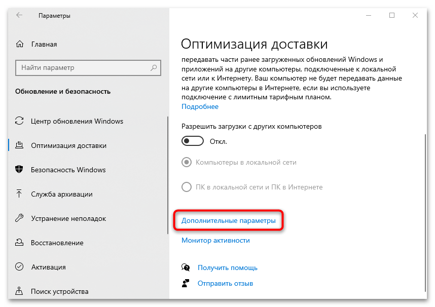 На этом отключение доставки обновлений завершено. Также есть возможность настроить функцию более тонко, чтобы не отключать ее совсем. Для этого кликните по строке «Дополнительные параметры».