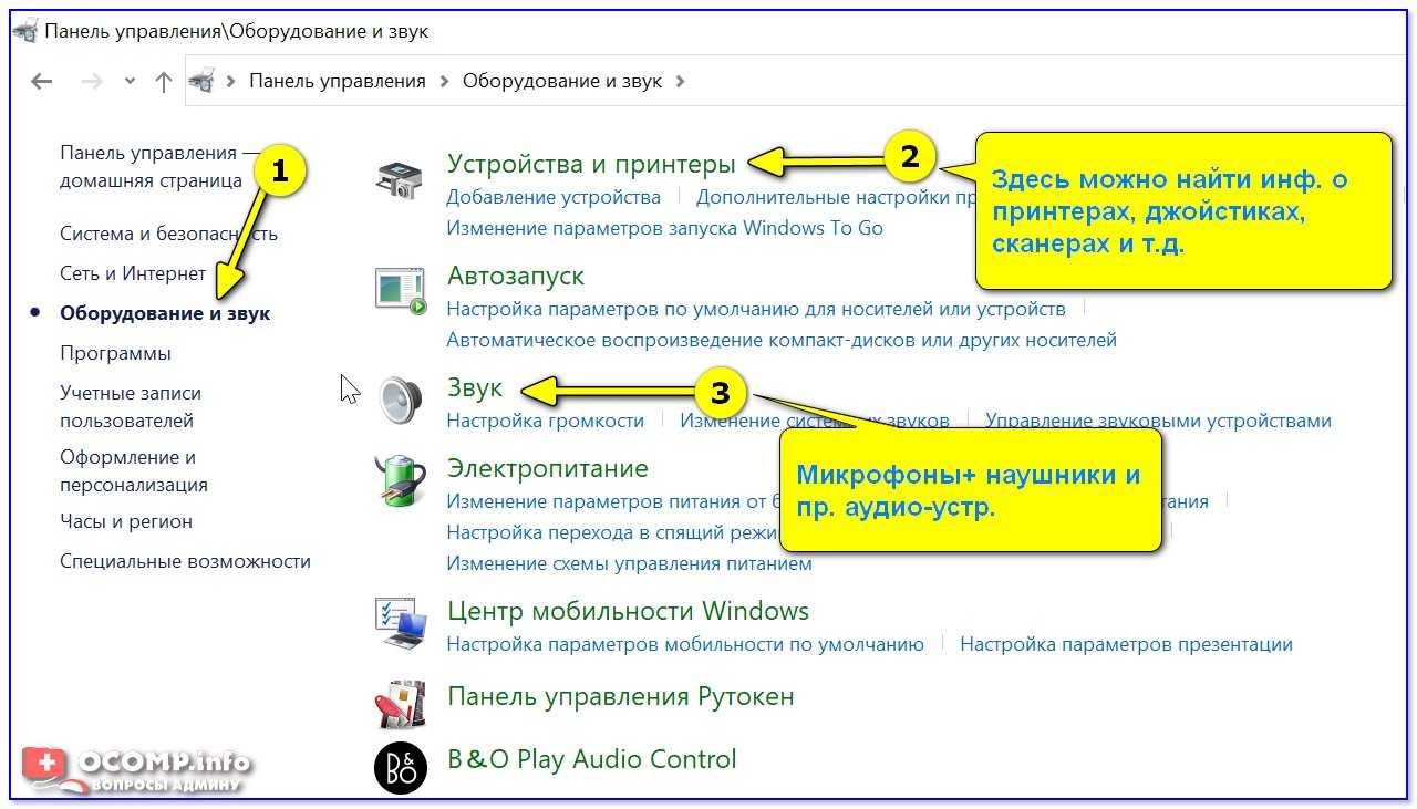 В ней необходимо открыть раздел «Оборудование и звук» — там прежде всего интересны 2 вкладки: «Устройства и принтеры» и «Звук» .
