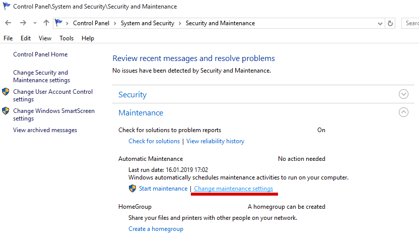 Control Panel > System and Security > Security and Maintenance > Change maintenance settings