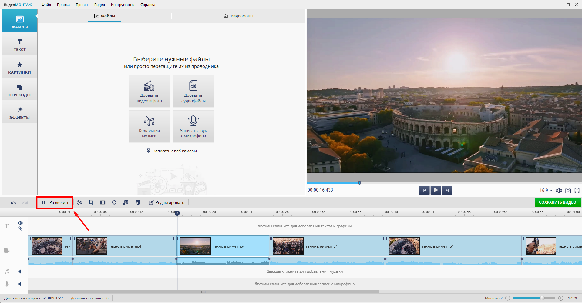 Если ролик длинный и нужно изменить только отдельный фрагмент, разбейте дорожку на части. Установите курсор в нужном месте и используйте кнопку «Разделить» слева над временной шкалой.