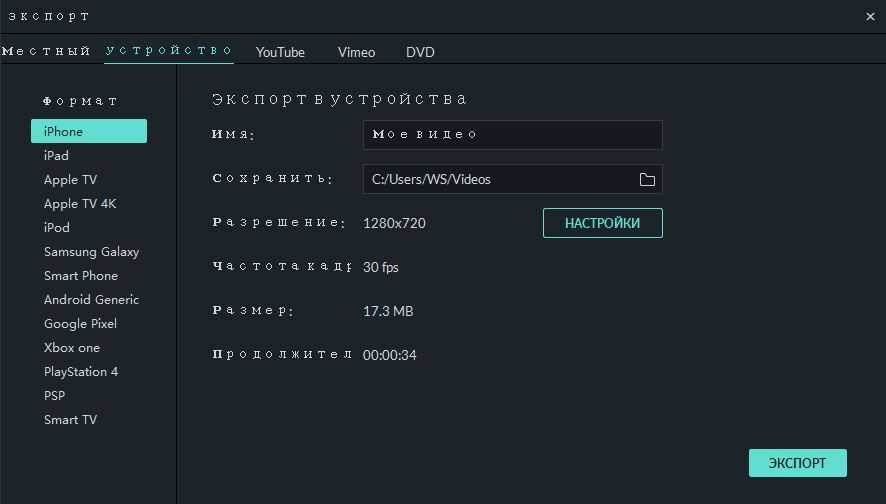 - Экспорт видео в нескольких форматах или оптимизация видео напрямую через YouTube, Facebook, Vimeo и т.д.;