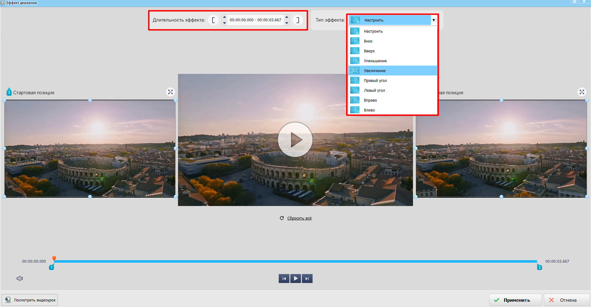 Также программа позволяет настроить движение камеры вручную. В левом окне задайте стартовый размер картинки. В правом окне настройте конечную позицию. Просмотрите результат в плеере в центре, нажав на кнопку Play.