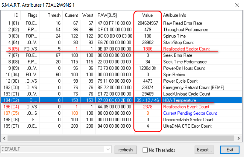 - THRESH – самое низкое значение value, после перехода за которое нужно сообщить что диск непригоден для эксплуатации;