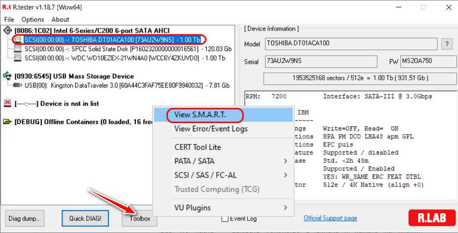 Бесплатная программа R.tester показывает нам характеристики жёстких дисков и может проводить их тестирование с целью решения проблем с бэд-блоками. В числе возможностей программы – отображение S.M.A.R.T. Для этого нужно нажать кнопку «Toolbox» и выбрать «View S.M.A.R.T.».