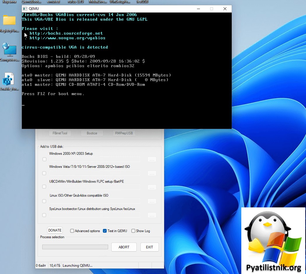 Когда все подготовительные требования выполнены, вы можете проверить загрузочную флешку на работоспособность, для этого просто нажмите «Run Qemu«. У вас запуститься окно эмулятора, где начнется проверка загрузочной флешки.