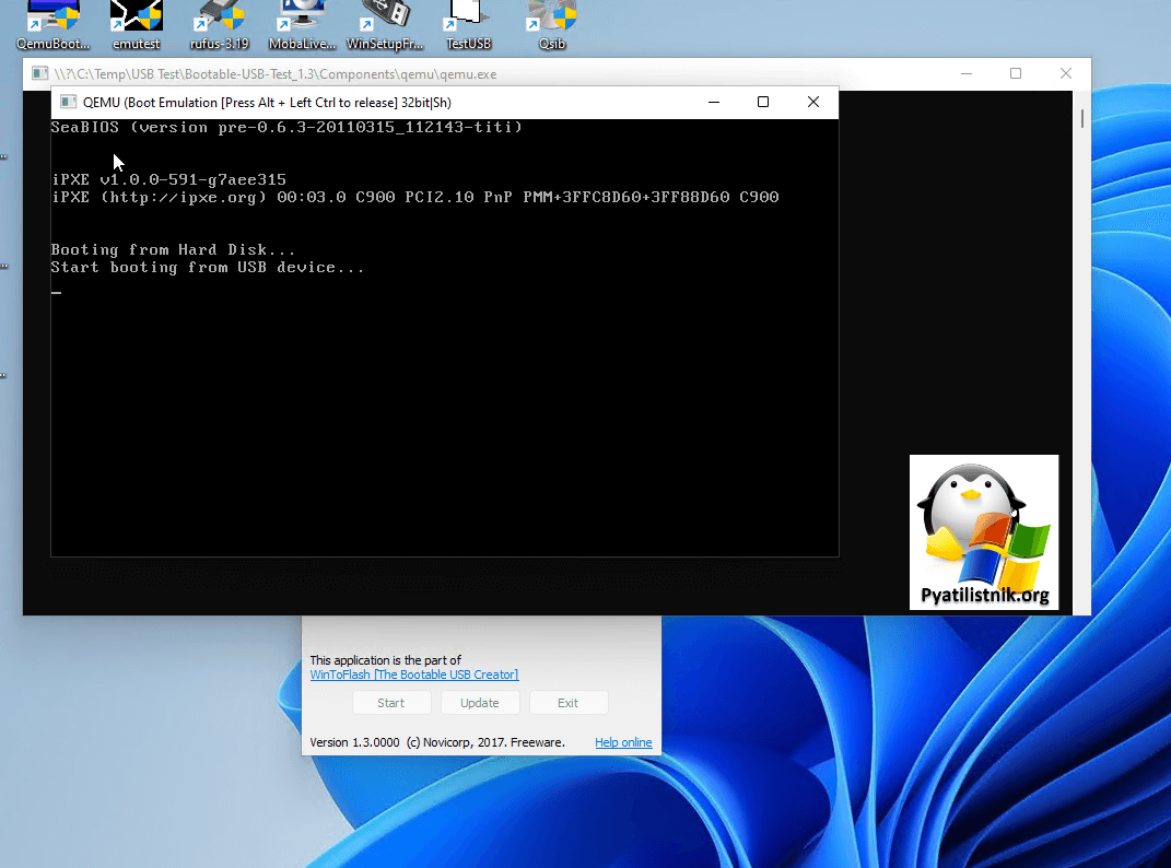 У вас так же будет открыто окно эмулятора QEMU. У меня сразу определился носитель, и идет попытка с него загрузиться, о чем свидетельствует надпись «Booting from Hard Drive — Start booting from USB device«