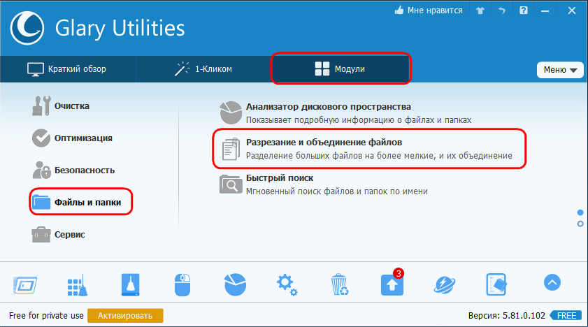 Любителям современных юзабельных продуктов для чистки и оптимизации Windows с массой вспомогательных утилит вдобавок, возможно, понравится работать с одним из таких. В число возможностей универсальной программы Glary Utilities 5 входит функция разрезки и объединения файлов. Она находится во вкладке программы «Модули», в составе раздела «Файлы и папки».