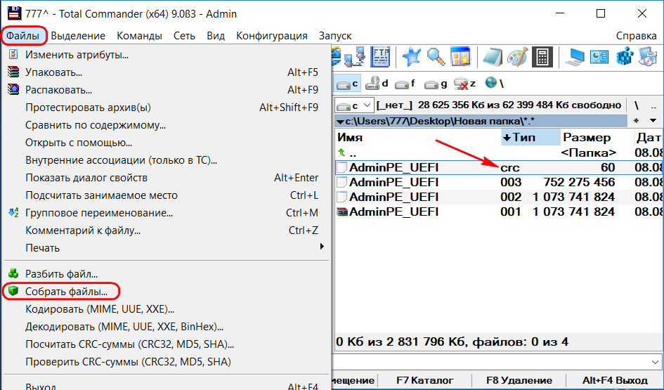 Чтобы собрать все части файла, разбитые в Total Commander, достаточно указать первый файл с расширением 001 и в меню Файл выбрать Собрать файлы…