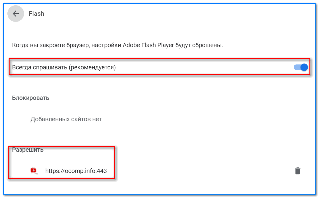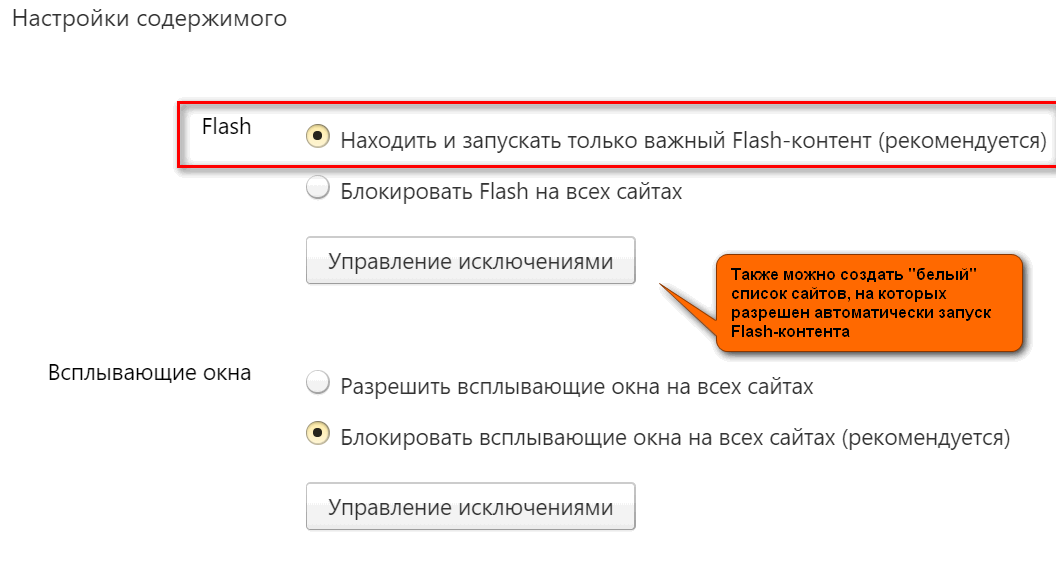 Кстати! Кроме этого, обратите внимание, что вы можете задать белый список сайтов, на которых браузер будет всегда запускать Flash (актуально для тех сайтов, которые вы регулярно посещаете)