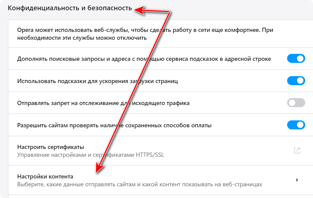 - После в разделе «Конфиденциальность и безопасность» перейти в подраздел «Настройки контента». …
