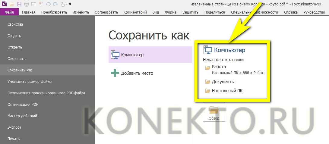 - 2. Если вам нужно, чтобы каждый лист был отдельным PDF-документом, в меню «Файл» перейдите в раздел «Инструменты» и нажмите выделенную на скриншоте кнопку. Далее укажите папку для сохранения.