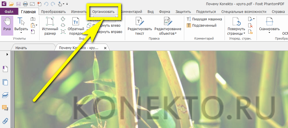 Открыть PDF-файл, используя соответствующую кнопку на панели управления или в меню «Файл», и переключиться на вкладку «Организовать».