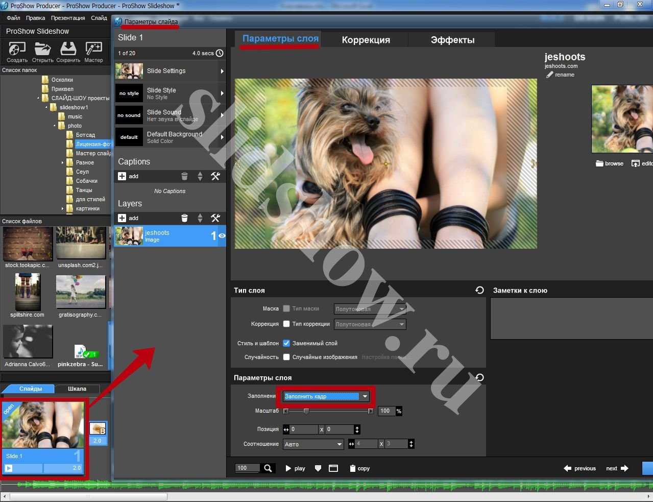 Давай научимся создавать самые простые эффекты фотографии (слайда). Такие, как приближение и отдаление. Двойным щелчком по слайду открываем окно «Параметров слайда». В первую очередь нас интересует вкладка «Параметры слоя», где я рекомендую выставить «Заполнение: Заполнить кадр».
