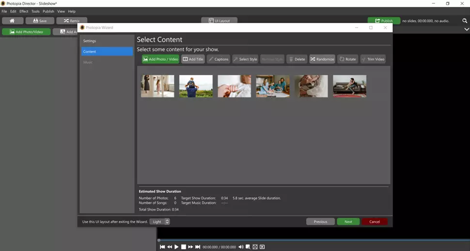 1. Загрузите материалы. В верхней части интерфейса нажмите на «New Project». Выберите опцию «Wizard» и установите пропорции проекта. В новом окне найдите заготовку для видео слайд-шоу и подтвердите действие. Кликните «Add Photo/Video» и импортируйте медиа.