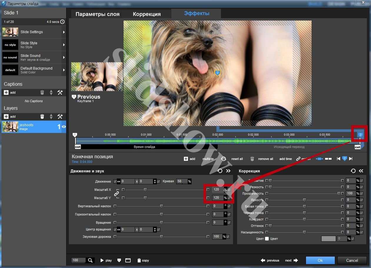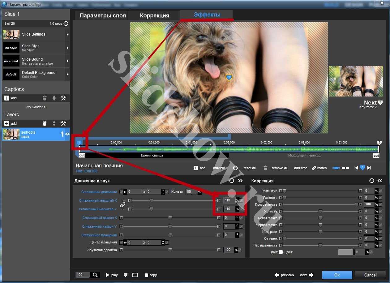 Давай теперь научимся делать фокус на определенную точку фотографии (движение). Т.е. чтобы фото не просто приближалось, а делало акцент на мордашке собачки. Для этого, оставаясь на втором ключевом кадре, потяни лапкой фотографию в сторону (на экране просмотра). Старайся не смещать ее на столько, чтобы появлялись пустые (черные) края. Это не красиво.