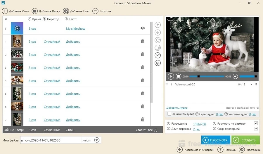 IceCream Slideshow Maker поможет собрать фотоснимки в видеопрезентацию и снабдить проект музыкальным треком. Приложение не отличается большой функциональностью, однако в нем есть базовые необходимые инструменты: настройка длительности слайдов, встраивание переходов, добавление текста. Аудиодорожку можно зациклить, сдвинуть на необходимое количество секунд и сделать эффект плавного затухания. Переходов достаточно много, но в основном они базовые: смещение вправо или влево, масштабирование, перевороты и прочее. А вот вариантов экспорта достаточно: можно выбрать видеоформат, загрузить на YouTube, Google Drive, Dropbox и прожечь DVD-диск.
